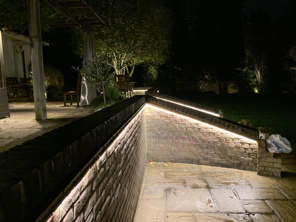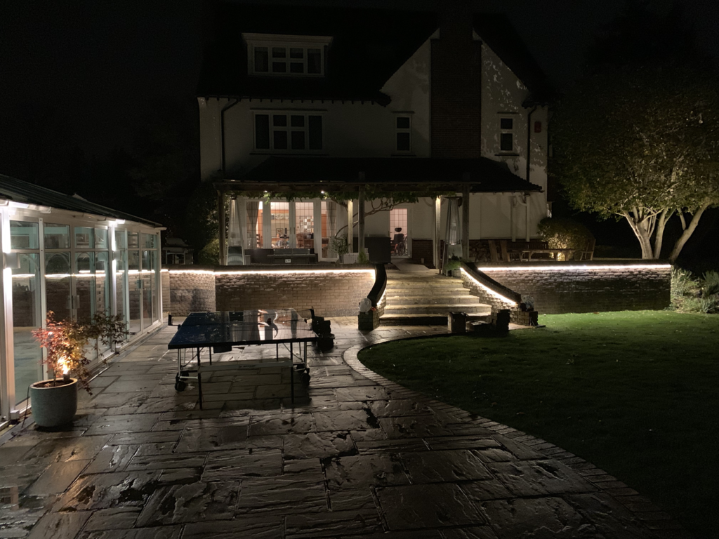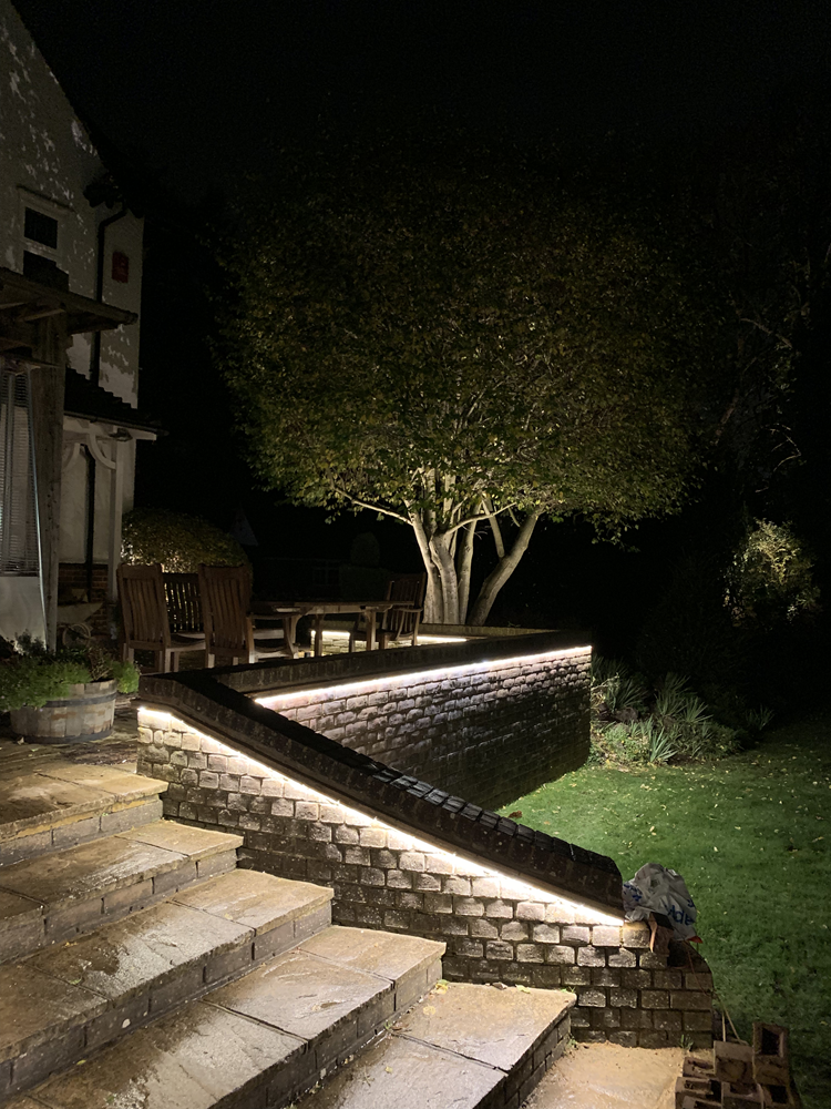 The project was to light a large back garden highlighting its length and width, whilst at the same time making its terrace off the house pretty and practical for those summer nights.