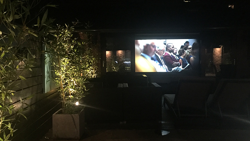 We also installed a TV distribution system to accommodate every available point in the house taking it’s sources from mostly localised equipment present in the key areas. One of those being the integrated home cinema in the rear extension, that saw a 100 inch automated screen with a 5.l full surround system to be delivered by one wall and two floor standing speakers at the front , and floor standing speakers for the rears to suit this room layout and application. Also here we installed a secondary translucent screen so we could then flip the projector image and back project onto the screen that is located on the threshold creating an outdoor cinema in the garden under the awning the just had the audio running in line through the garden audio zone on the pair of waterproof outdoor stereo speakers. Cleverly creating two applications in one! Inner city living at it’s best!