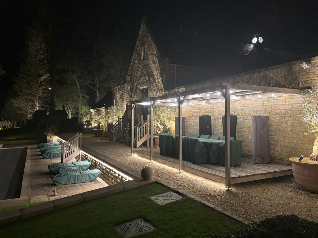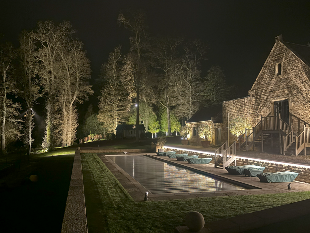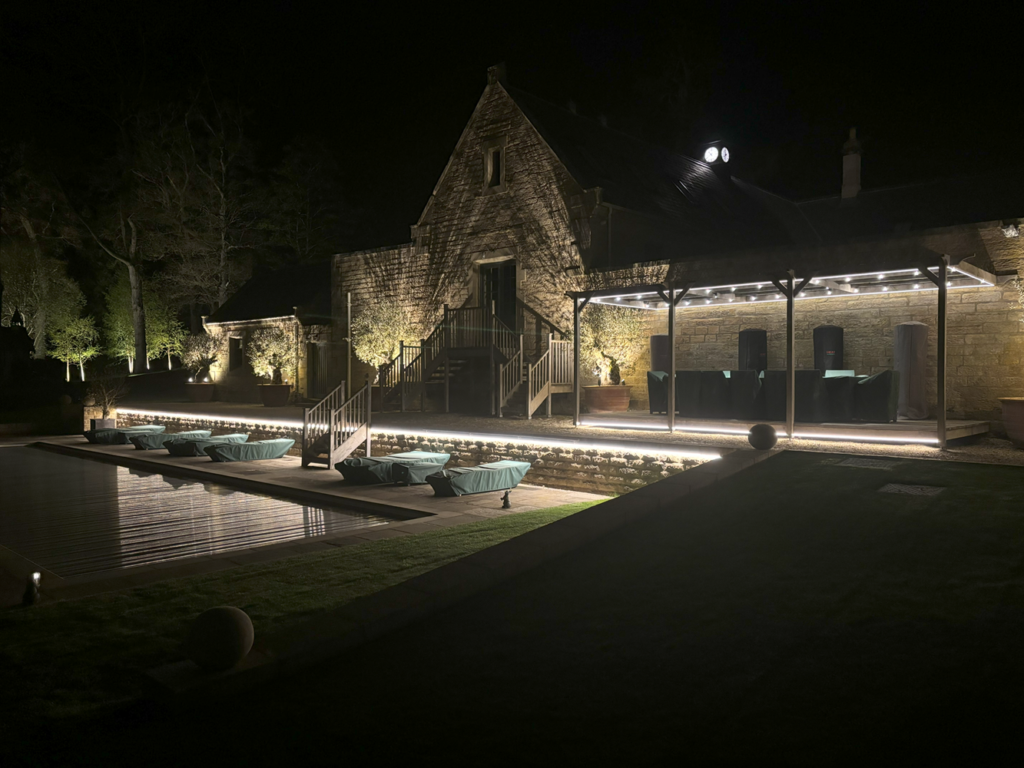 This was an exciting, interesting project that was to be zoned and dimmed to give moods for different events and seasons as it was used all year around with an outdoor pool kept at 30 degrees, so the pool is used on winter evenings as well, when it is dark at 4pm.